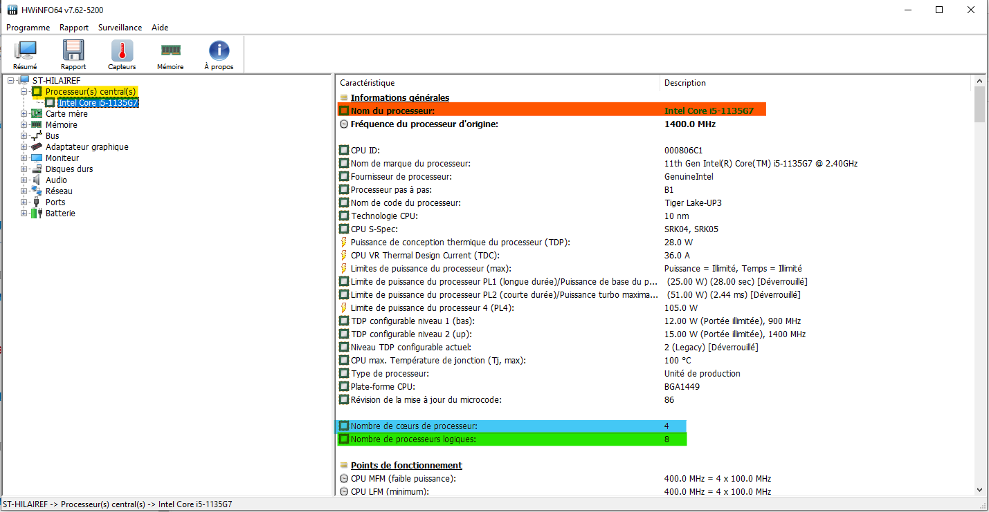 La section Processeur(s) central(s) permet d'obtenir l'information du processeur.