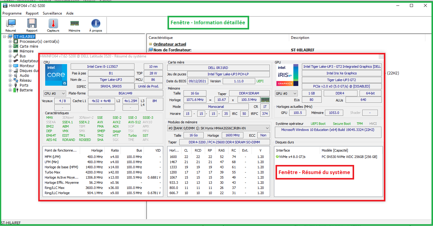 Il y a 2 fenêtres pour afficher l'information. Dans ce cours, vous allez utiliser la fenêtre information détaillée (en vert) . Il faut fermer la fenêtre résumé du système (en rouge).