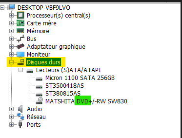 Le disque inséré dans le tiroir doit apparaître Disques Durs -> Lecteurs (S)ATA - ATAPI.