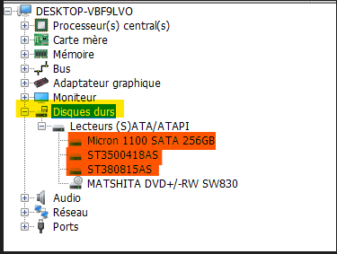 Dans l'exemple ci-dessous, ce sont les éléments en orange qui correspondent au disque SSD et HDD.