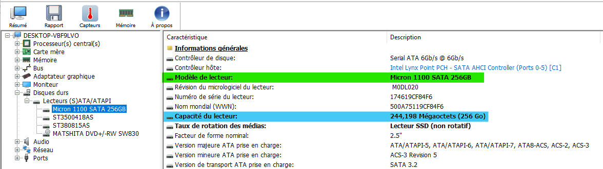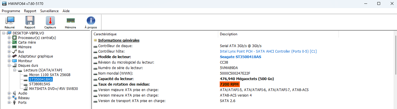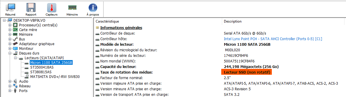 Pour déterminer si le disque est SSD ou HDD, il faut vérifier la ligne Taux de rotation des médias.
