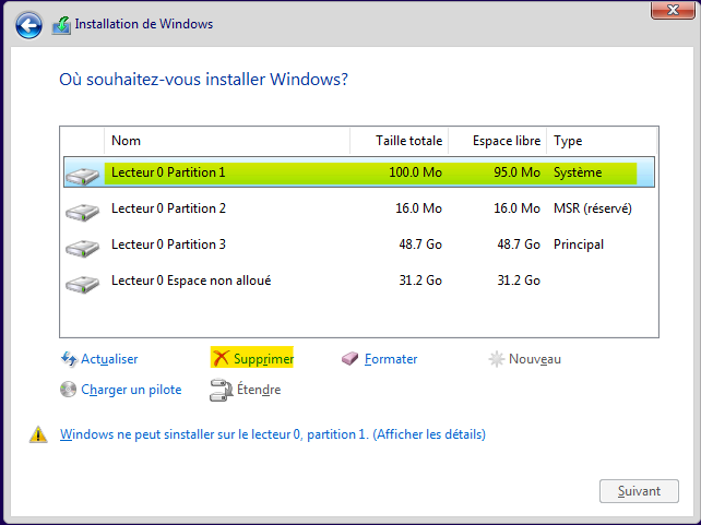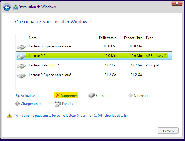 Il est possible que l'utilitaire ne soit pas en mesure de supprimer une partition.