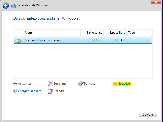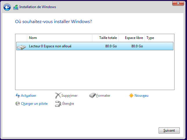 Il doit avoir uniquement la mention Lecteur 0 Espace non alloué.