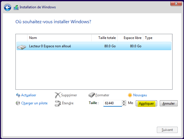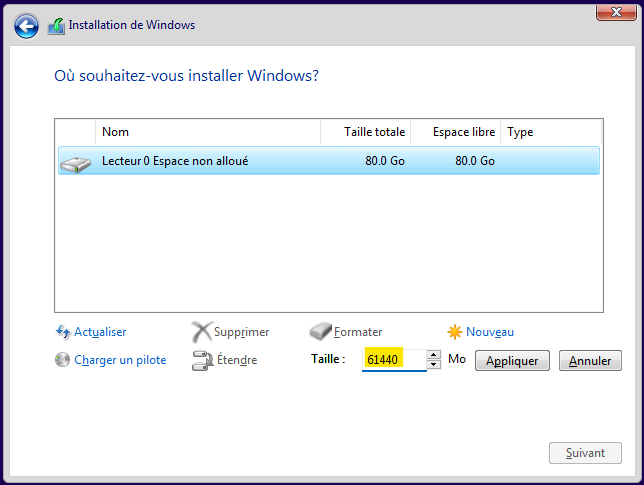 Indiquez l'espace alloué en Mébioctet pour l'installation de Windows.