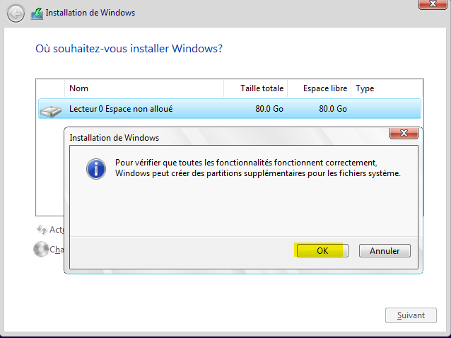 Appuyez sur le bouton OK pour créer toutes les partitions nécessaires au démarrage de Windows.