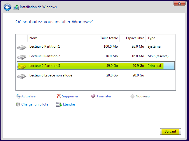 Il est préférable de créer uniquement la partition principale. Si d'autres partitions sont nécessaires, il faut le faire à partir de Windows.