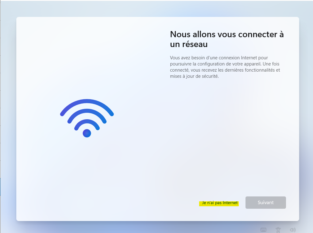 Pour être en mesure de configurer un compte local, il faut désactiver l'obligation d'avoir internet.
