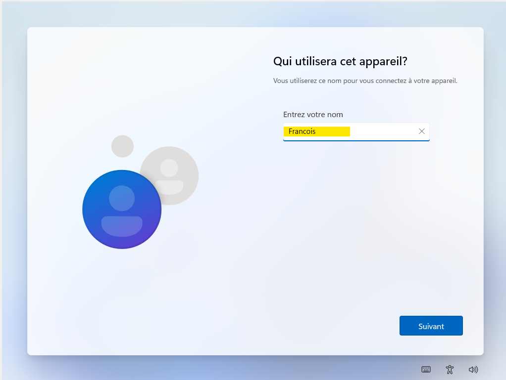 Inscrivez le nom de l'utilisateur et appuyez sur le bouton Suivant.