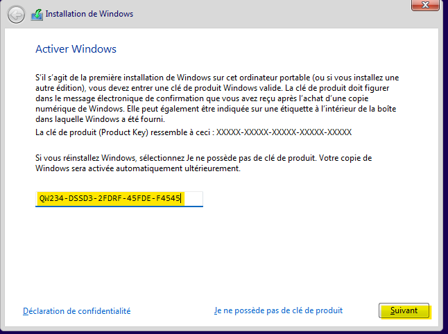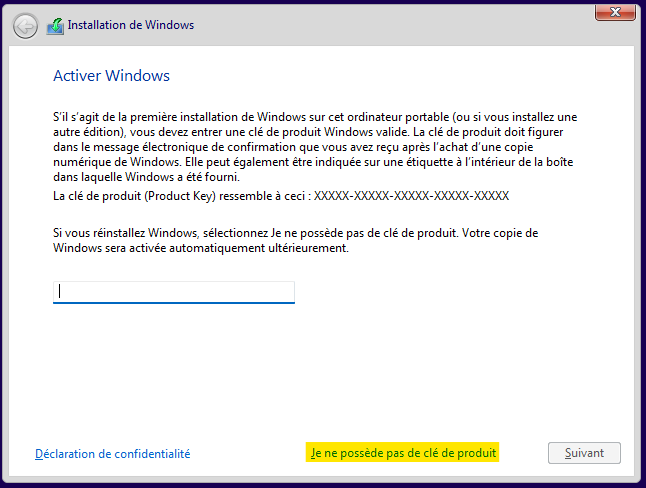 Si vous n'avez pas la clé, il est possible d'installer Windows. L'installation ne sera pas activée. Il est possible d'inscrire la clé par la suite dans Windows.