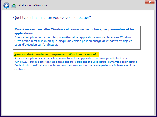 Sélectionnez l'option Personnalisé : installer uniquement Windows (avancé).