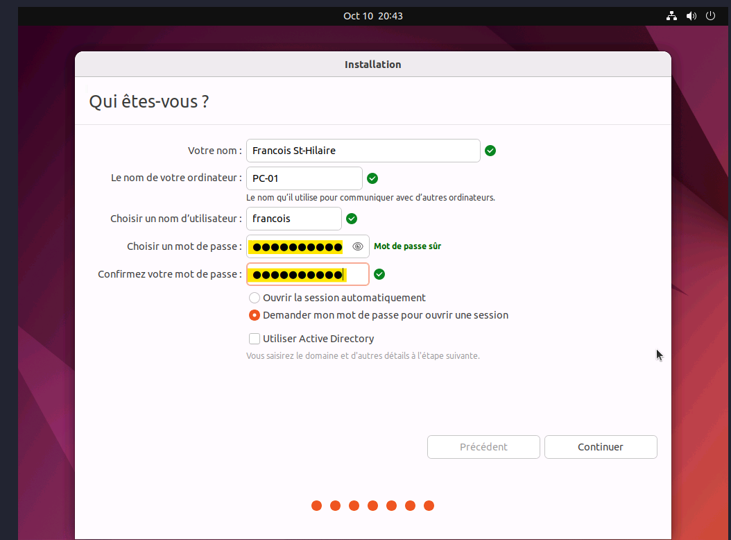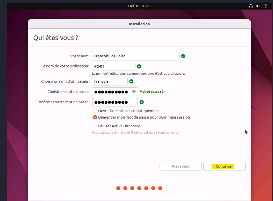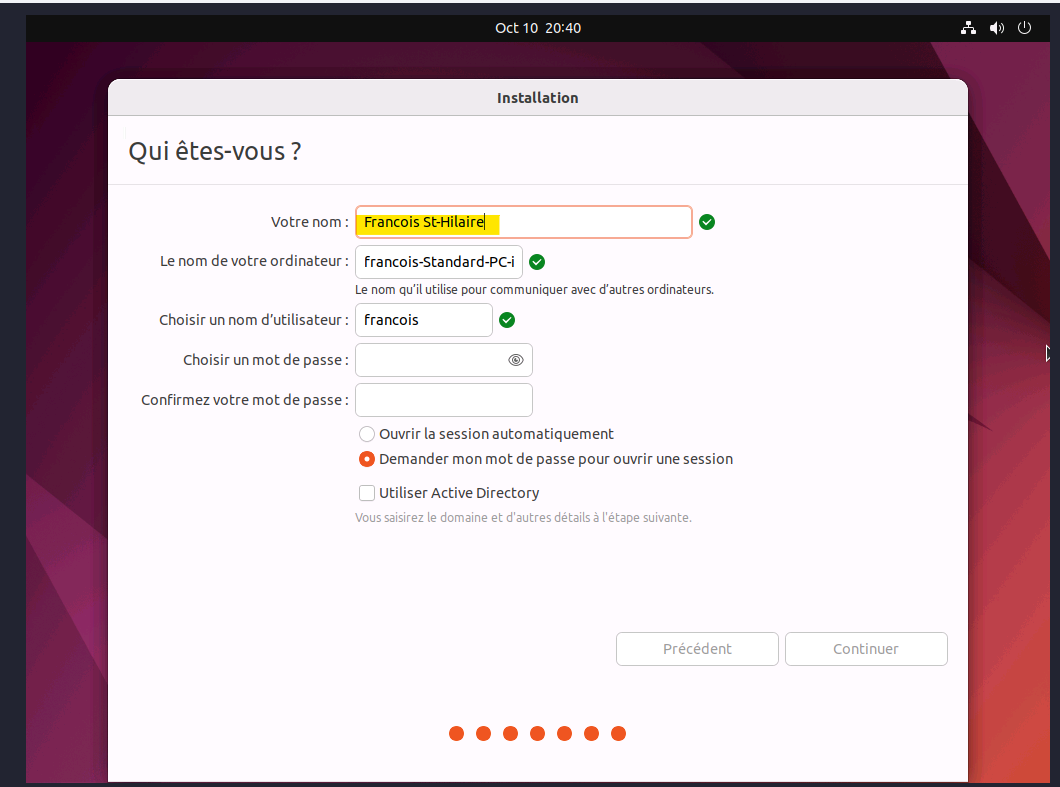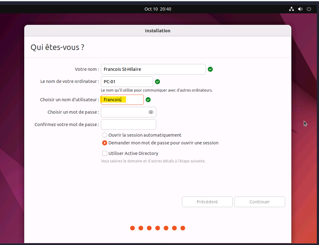 Dans le champ Choisir un nom d'utilisateur, veuillez inscrire le nom de l'utilisateur principal de l'ordinateur.