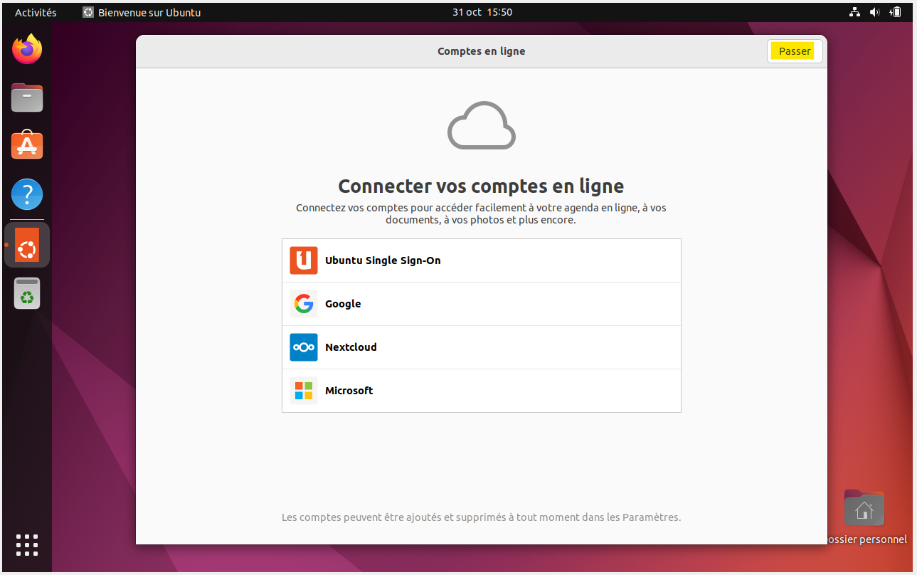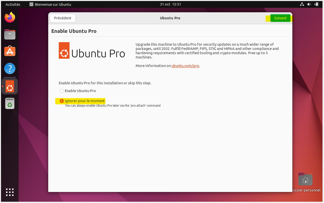 Sélectionnez l'option Ignorer pour le moment pour le service Ubuntu Pro. Appuyez sur le bouton Suivant.