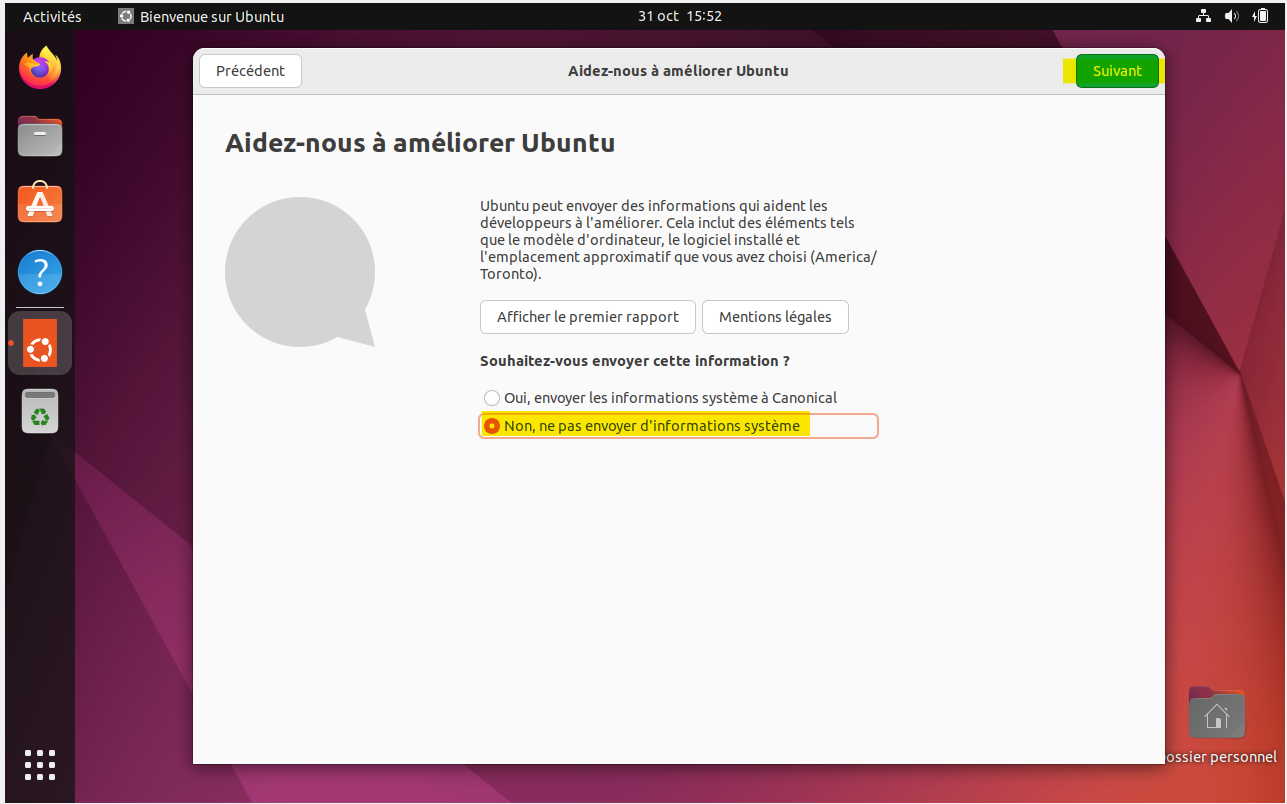 Sélectionnez l'option Non, ne pas envoyer d'informations système et appuyez sur le bouton Suivant.