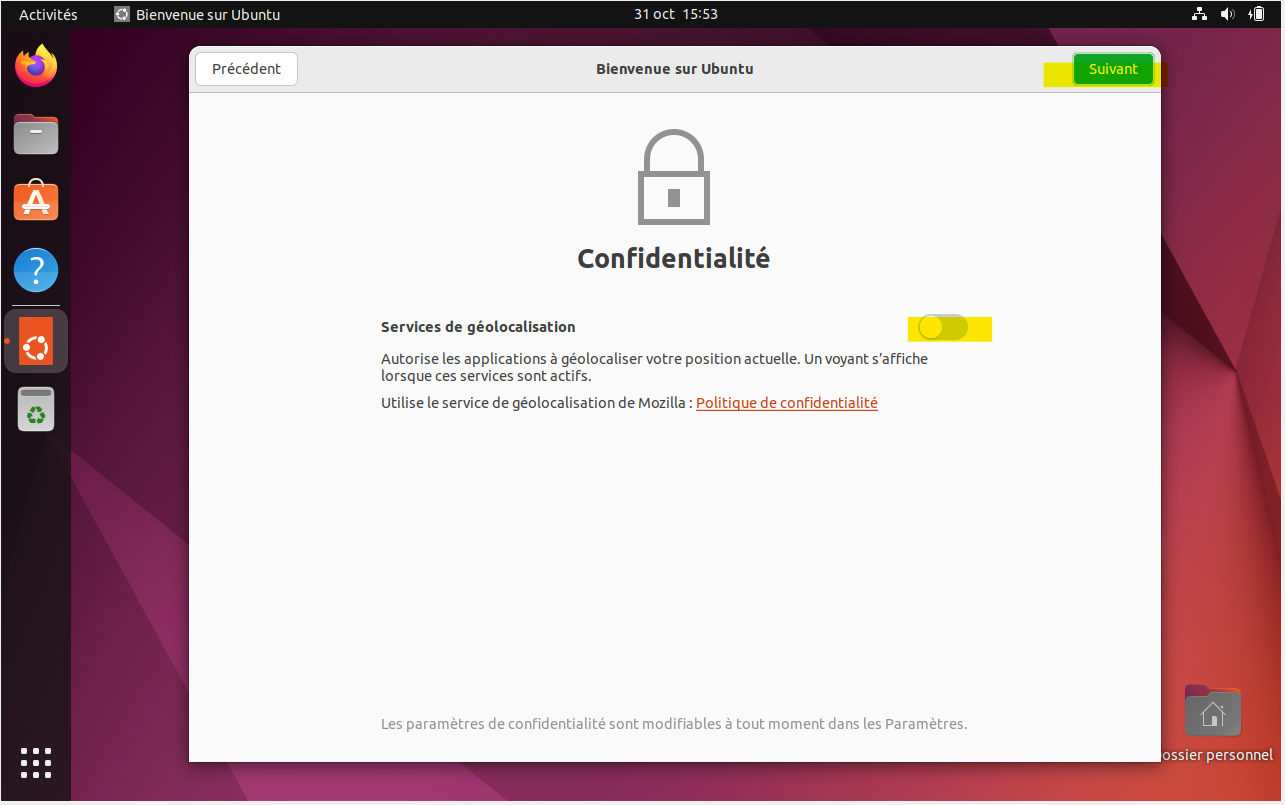 N'activez pas le service de géolocalisation. Appuyez sur le bouton Suivant.
