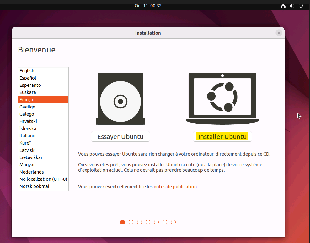 Au démarrage du programme, il faut choisir le mode d'installation Sélectionnez Try or Install Ubuntu. Appuyez sur Enter pour confirmer.