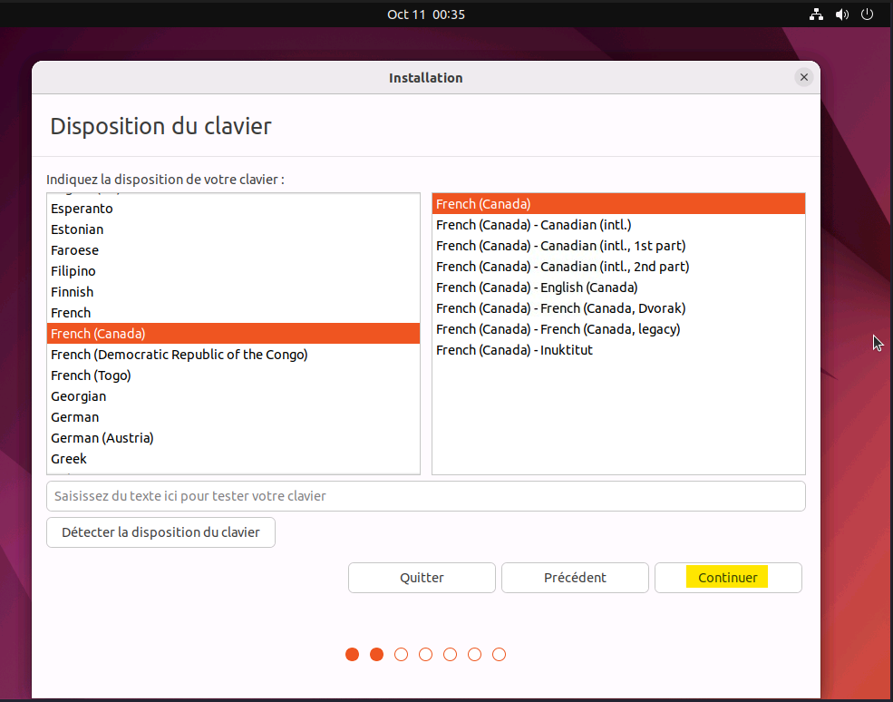 Sélectionnez la disposition du clavier et appuyez sur le bouton Continuer.