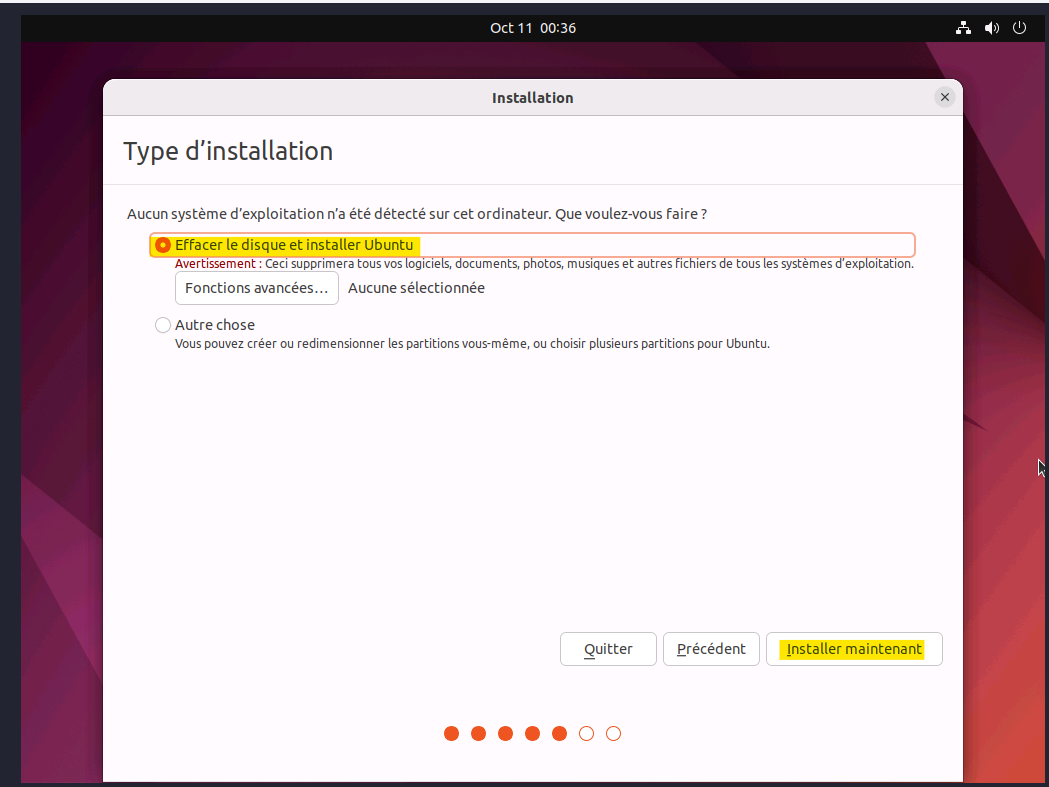 Sélectionnez l'option Effacer le disque et installer Ubuntu. Il est préférable de laisser le programme d'installation de créer les partitions.