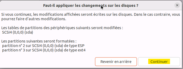 Appuyez sur le bouton Continuer pour accepter la création des partitions.