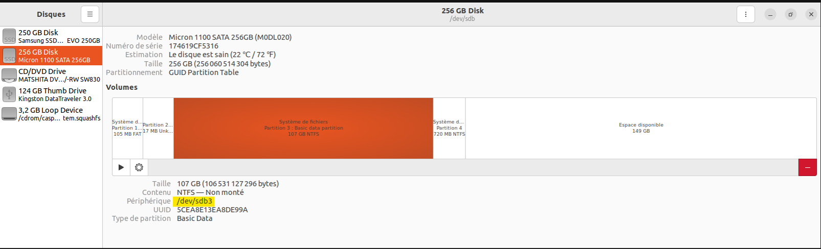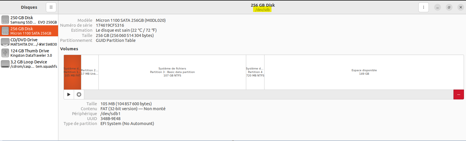 L'identifiant système est comme ceci : /dev/sd@#. Le @ correspond à la lettre de l'unité de stockage. Le # correspond à un chiffre qui désigne la partition