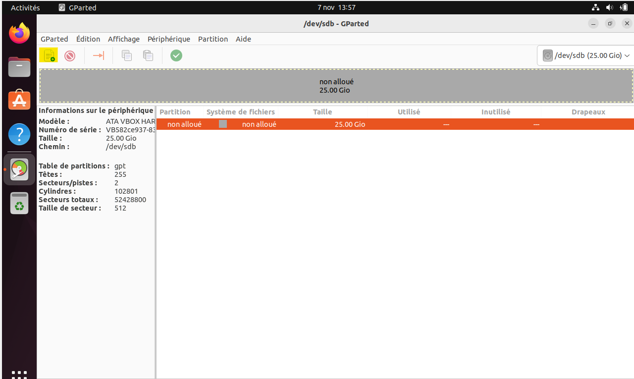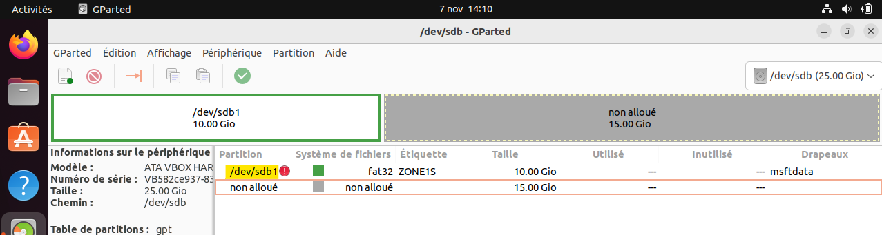 La partition a maintenant un identifiant système de type /dev/sd@#.