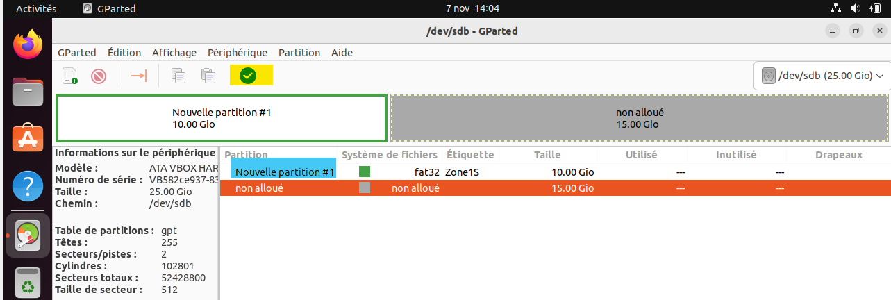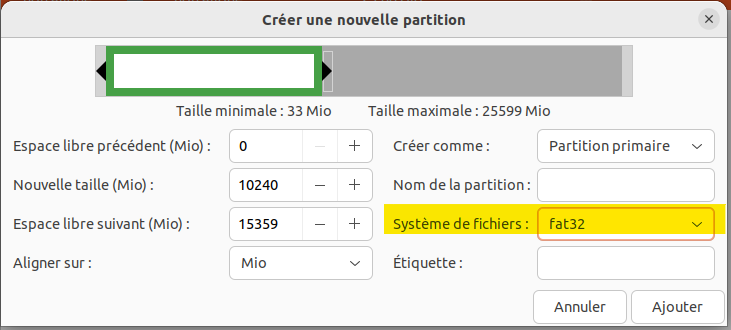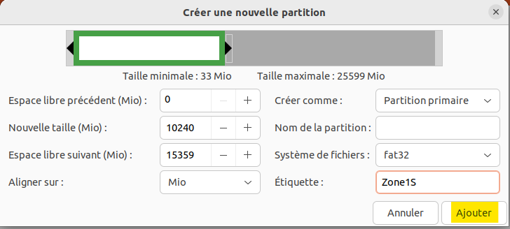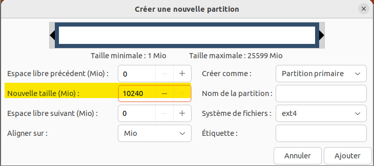 Dans l'exemple ci-dessous, il s'agit d'une partition de 10 Gio ou 10 240 Mio.