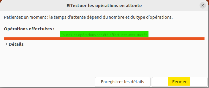 Appuyez sur le bouton Fermer dans la fenêtre du statut des opérations.