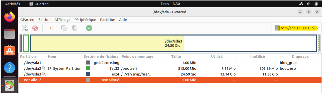 Vous pouvez utiliser l'utilitaire Disques pour reconnaitre plus facilement l'unité de stockage avec son identifiant système ou afficher l'information du disque dans GParted.