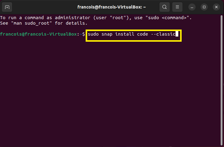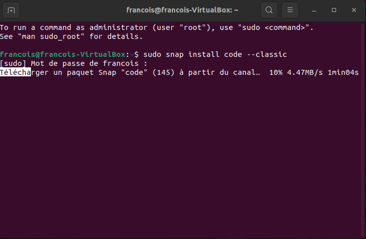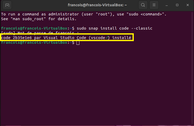 AvertissementSous Ubuntu, lorsqu'il faut inscrire le mot de passe dans le terminal, il n'y a aucun indicateur (*****) pour spécifier qu'un caractère est inscrit.