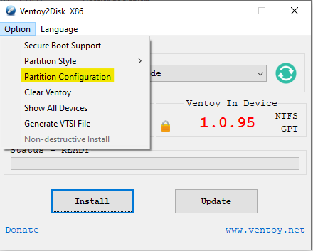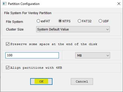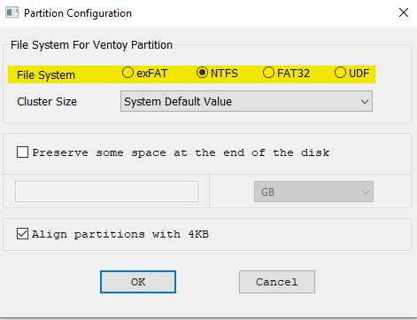 Il est possible de spécifier le système de fichiers de la partition Ventoy.