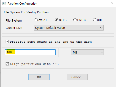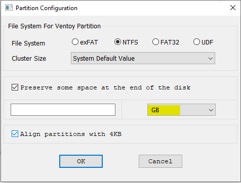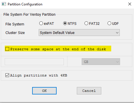 Par défaut, la partition Ventoy prend tout l'espace disponible sur la clé.