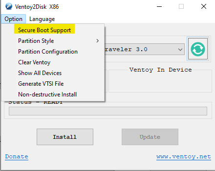Dans le menu Option, décochez l'item Secure Boot Support.
