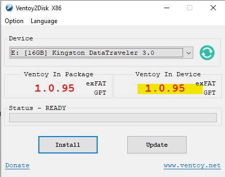 - La partie de droite indique la version de Ventoy de la clé sélectionnée.
