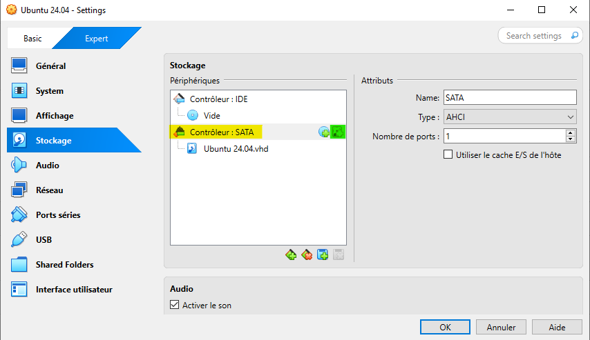 Sélectionnez la ligne Contrôleur : SATA (jaune) dans la section Périphériques. Appuyez sur le bouton Ajouter un disque dur (vert).