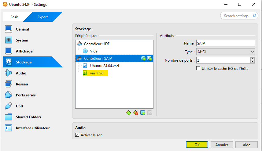 Le nouveau disque est dans la liste Contrôleur : SATA. Appuyez sur le bouton OK.