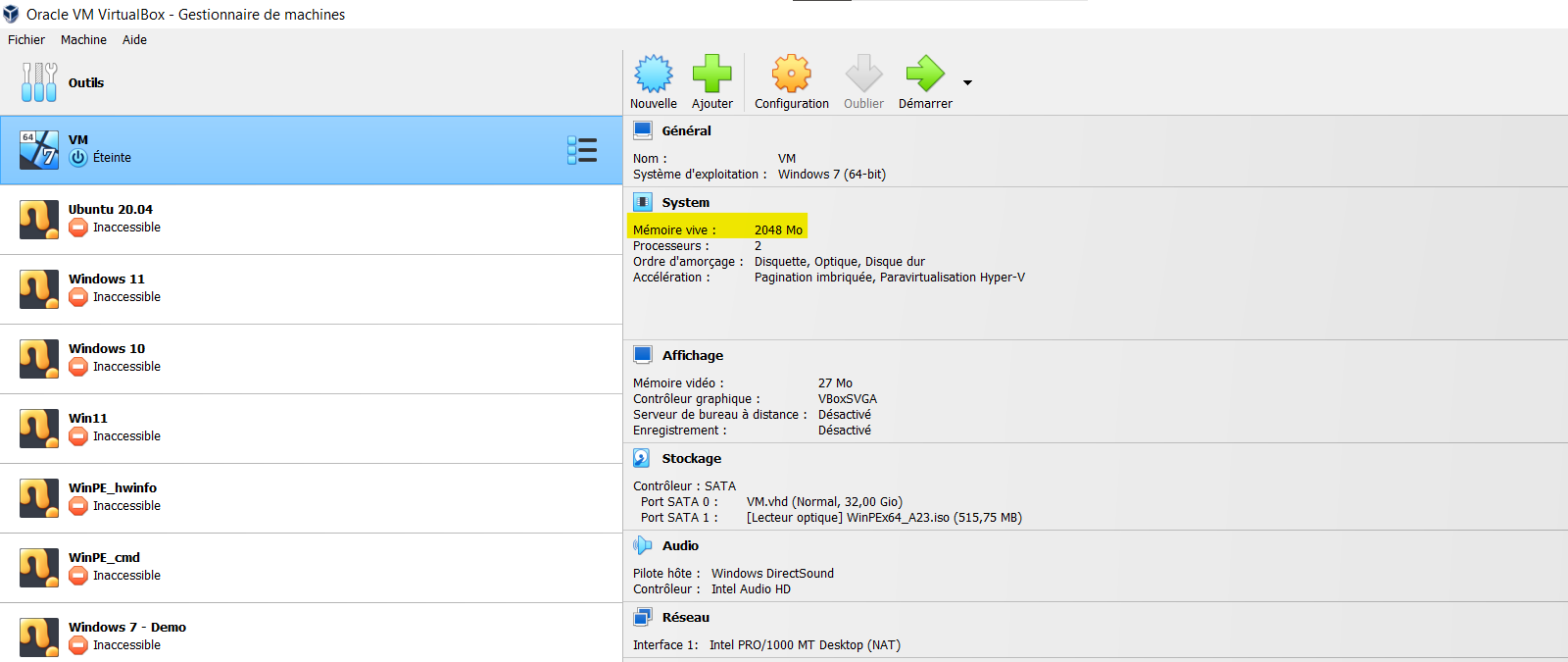 Dans l'exemple ci-dessous, la machine a 2048 Mo ou 2 Go de mémoire vive.