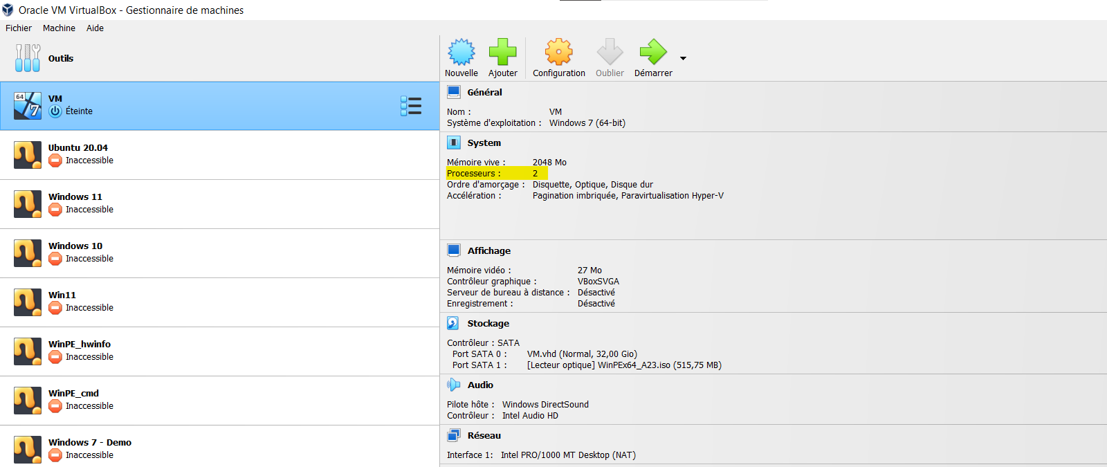 Dans l'exemple ci-dessous, la machine virtuelle a 2 processeurs.