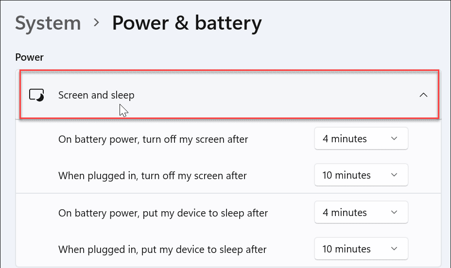 Ouvrez la section Écran et veille. Les options pour les modes batterie et branché seront dans la liste.