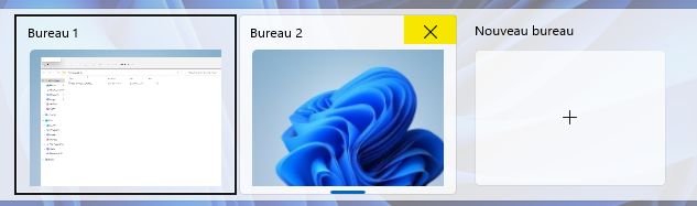 Pour fermer un bureau virtuel, il faut mettre le curseur sur le bureau. Un bouton X sera disponible.