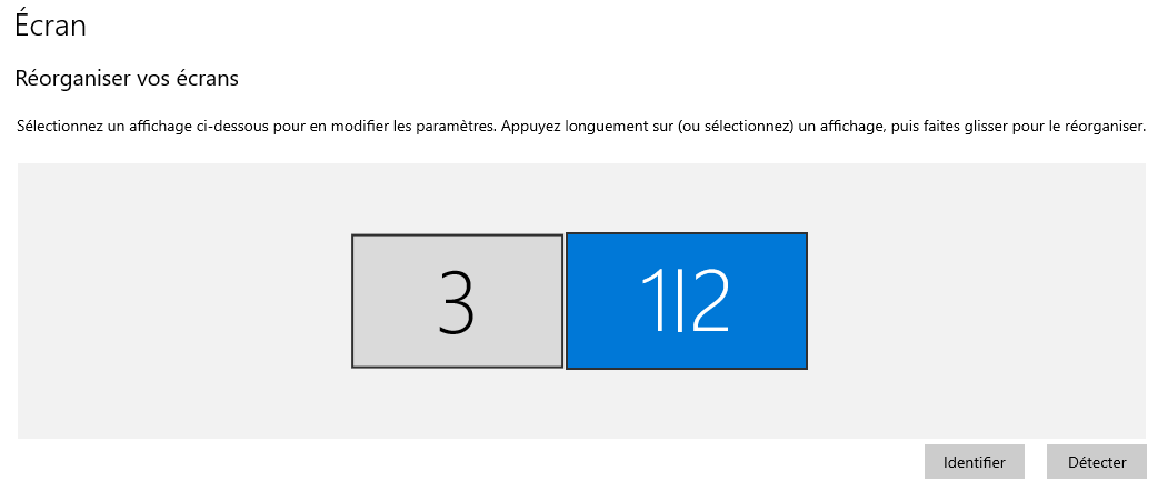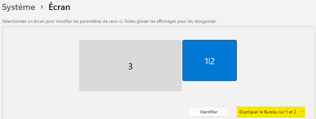 Dans l'exemple ci-dessous, l'écran 1 et 2 sont en mode duplication et l'écran 3 en mode étendre l'affichage. La barre verticale | entre les numéros, indique une duplication.