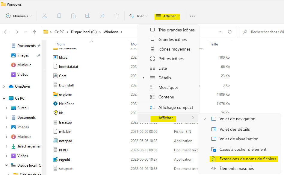 Par défaut, Windows masque l'extension des fichiers connus. Pour un informaticien, il est préférable de les afficher en tout temps.