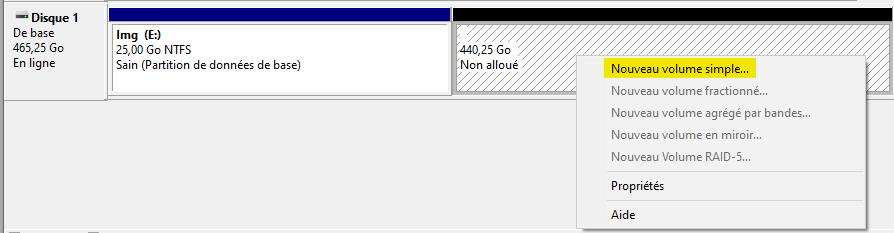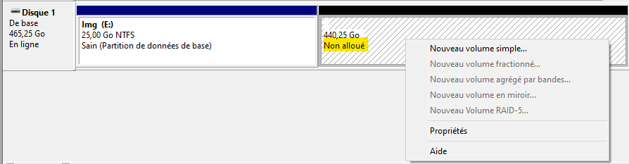 Effectuez un clic-droit dans la zone avec la mention Non alloué de l'unité de stockage.