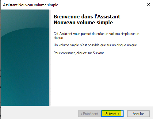 Appuyez sur le bouton Suivant > de la fenêtre Assistant Nouveau volume simple.