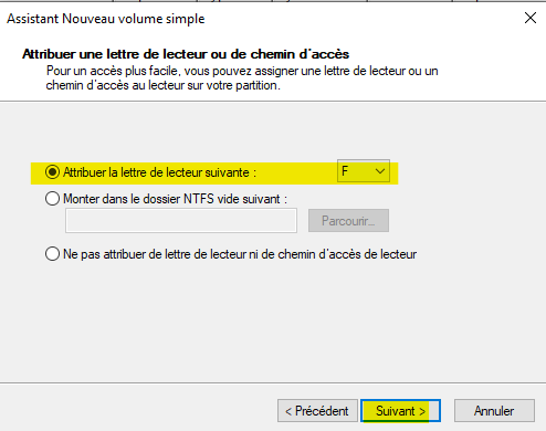 Spécifiez la lettre du lecteur pour le montage de la partition. Appuyez sur le bouton Suivant >.