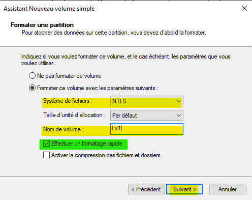 Spécifiez le système de fichiers et le nom du volume. Important, il faut mettre le crochet pour Effectuer une formatage rapide, sinon la création sera très longue.
