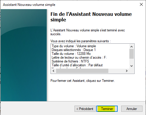 Appuyez sur le bouton Terminer pour créer la partition.