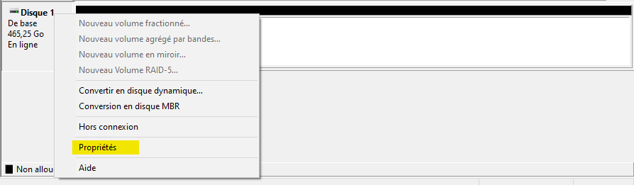 Effectuez un clic-droit sur le numéro de disque. Sélectionnez l'item Propriétés.