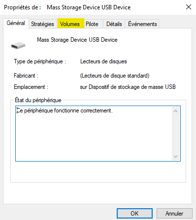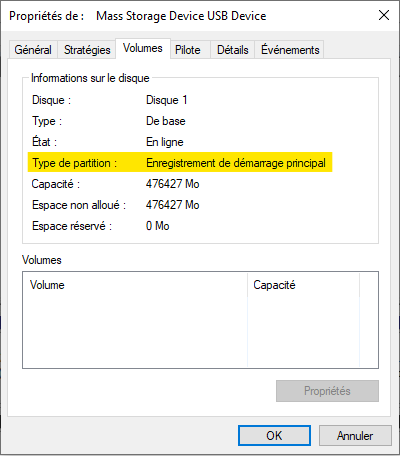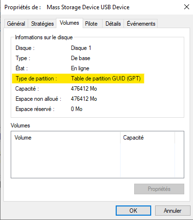 Pour identifier le style de partition, il faut aller dans les propriétés de l'unité de stockage.