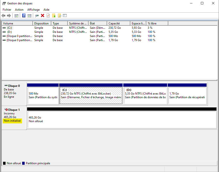 Si le disque est déjà initialisé, il n'est pas possible de le réinitialiser de nouveau à partir de Gestion du disque. Il faut supprimer chacune des partitions.