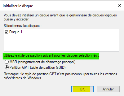 Pour être en mesure de créer des partitions, il faut initialement initialiser l'unité de stockage en MBR ou GPT.