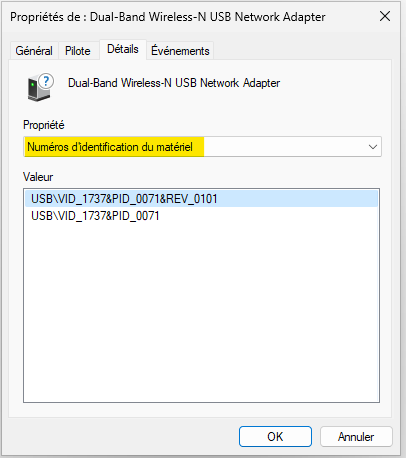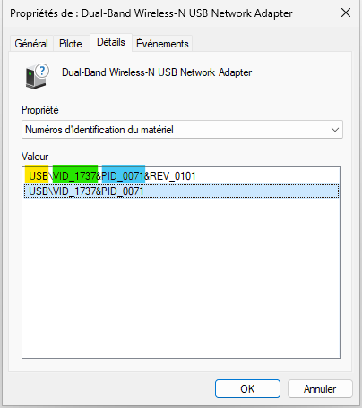 En bleu c'est le numéro de la pièce (PID_ ou DEV_)